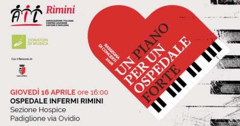Giovedì 16 aprile alle ore 16:00 l’Hospice dell’Ospedale Infermi di Rimini ospiterà un nuovo appuntamento della rassegna “Un PIANO per un ospedale FORTE”, promossa da AIL Rimini – Associazione Italiana contro Leucemie, Linfomi e Mieloma, in collaborazione con Donatori di Musica e con il patrocinio del Comune di Rimini. Protagoniste del concerto saranno due pianiste:Jole […]