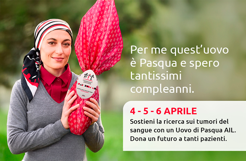 Per permettere a tante vite di continuare abbiamo bisogno del tuo aiuto: il 4-5 e 6 aprile scegli le Uova di Pasqua AIL. Con un contributo minimo di 15 euro ci aiuterai a sostenere la lotta contro leucemie, linfomi e mieloma e a portare aiuto a tanti pazienti.
